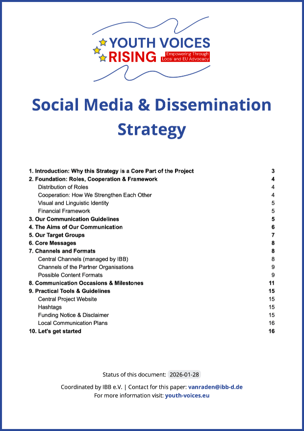 Die Kommunikation über das Gesamtprojekt wird vom Internationalen Bildungs- und Begegnungswerk (IBB e.V.) aus Dortmund koordiniert. Die Strategie legt detailliert fest, wie die Forderungen und Projektfortschritte über verschiedene digitale Formate sichtbar gemacht werden. Die konkreten Maßnahmen reichen von Sharepics mit Zitaten und kurzen Videos für Social Media bis hin zu Best-Practice-Berichten und Methodenbeschreibungen für den News-Blog. Um die Menschen europaweit vor Ort zu erreichen, setzt das Konzept auf konsequente Mehrsprachigkeit und verzahnt zentrale Plattformen wie die Projektwebsite direkt mit den lokalen Kanälen der beteiligten Jugendorganisationen.